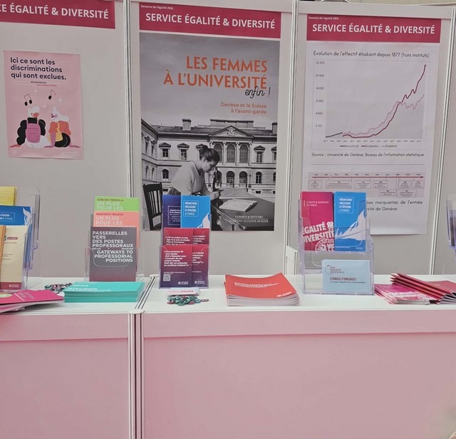Cette année, la célébration du 8 mars en Suisse intervient dans un contexte particulier : le pays marque également les 30 ans de la Loi fédérale de l’égalité entre homme et femme (LEg), entrée en vigueur le 24 mars 1995. Dans ce contexte, l’Université de Genève a mis en lumière l’histoire et les avancées des femmes dans l’enseignement supérieur. Au cœur du stand du Service Égalité et Diversité, une affiche attire particulièrement l’attention : « LES FEMMES A L’UNIVERSITÉ… enfin ! Genève et la Suisse à l’avant-garde ».