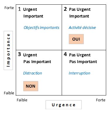 L’urgent ne devrait jamais avoir la priorité sur l’important. En examinant rétrospectivement sa semaine ou son mois passé, vous regrettez parfois amèrement le temps consacré à des « broutilles » qui, pourtant, ont paru urgentes sur le moment.