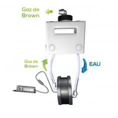 Le principe de fonctionnement du kit est simple. Le gaz de Brown est obtenu par électrolyse de l’eau. Dans la cellule du kit, un courant électrique continue (12 ou 24 Volt) électrolyse l’eau. Cette électrolyse produit l’oxy-hydrogène qui, de par sa densité, s’échappe de la cellule par le tuyau de sortie en haut de la cellule et est directement injecté dans la chambre de combustion.