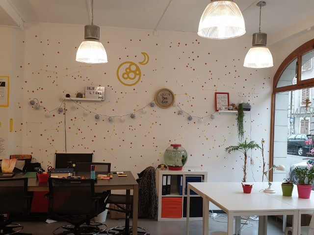En arrivant à l’arcade de co-working de « Cric crac croc », l’espace qui abrite « Idfuse », on rentre dans un univers clair et aéré, où les murs sont peints avec des dessins naïfs, représentant des soucoupes volantes, des fusées ainsi que les véritables constellations célestes.