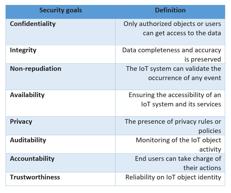 The table below highlights the security goals introduced by the IAS-octave, along with their definitions associated with the IoT environment.