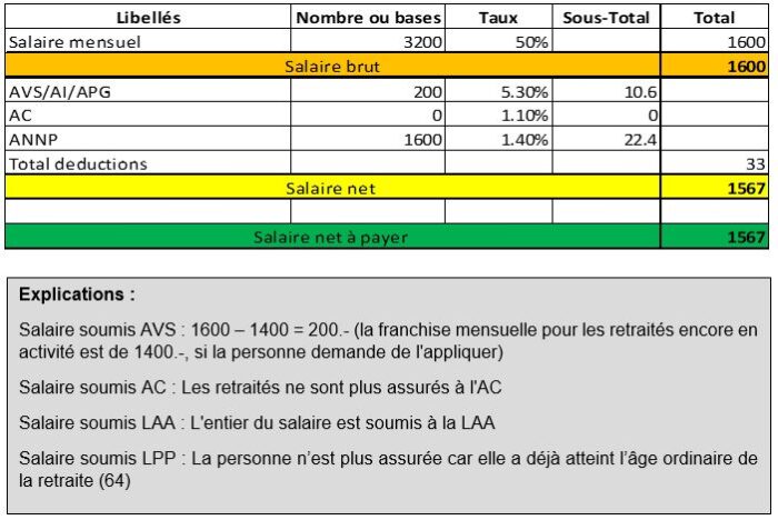 Madame Claire Moreau, 65 ans, est une retraitée qui a décidé de travailler à temps partiel pour compléter sa pension. Depuis le 1er septembre 2024, elle est employée comme assistante dans une bibliothèque municipale. Son salaire mensuel brut est de CHF 3'200.- pour un emploi de 100 %. Bien qu'elle soit retraitée, elle continue de percevoir sa rente de vieillesse. Elle demande à ce qu'on applique la franchise. Son statut de retraitée lui permet de travailler sans perdre ses droits à la pension. Faites le salaire pour le mois d'octobre