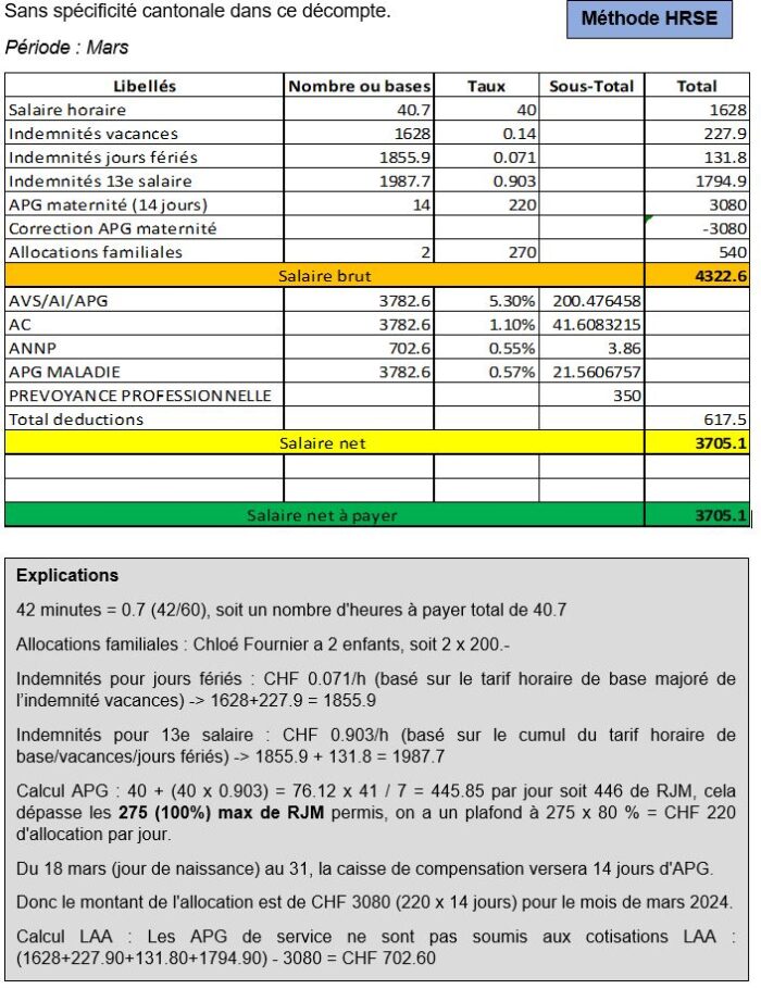 Madame Chloé Fournier, 22 ans, travaille comme développeuse web dans une start-up. Elle est actuellement en congé maternité depuis le 18 mars 2024, après avoir donné naissance à son deuxième enfant. Selon son contrat, elle bénéficie d'un congé maternité de 14 semaines (16 à Genève), son salaire horaire de base est de CHF 40, il est maintenu à 100 % par son employeur. Elle a effectué 40 heures et 42 minutes selon le dernier relevé de Mars. Chloé est mariée et bénéficie d’une allocation familiale par enfant de CHF 270.- par mois. Travail hebdomadaire dans l'entreprise fixé à 41h.