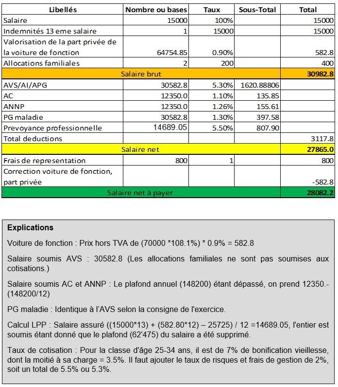 Monsieur Vincent Lambert, 33 ans, est un cadre supérieur dans une entreprise de technologie. Il perçoit un salaire brut mensuel de CHF 15'000 (x13). -. Son contrat comprend un 13ème salaire versé en décembre 2024, ainsi qu’une voiture de fonction d’une valeur de CHF 70'000 (TTC). -, qu’il peut utiliser pour des trajets privés. Vincent bénéficie également d'une allocation de CHF 800.- par mois pour ses frais de représentation, validée par l’administration fiscale. Étant marié et père de deux enfants, il reçoit également des allocations familiales d’un montant de CHF 400.- pour ses enfants.