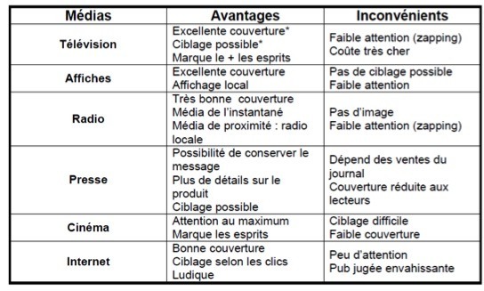 Les moyens utilisés pour faire de la publicité sont les six grands médias ci-dessous avec des avantages et des inconvénients.