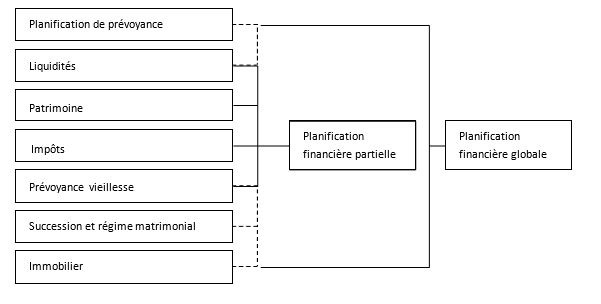 L’organisation d’une succession ou du régime matrimonial permet d’éviter une mauvaise répartition du patrimoine ainsi que de potentielles mauvaises surprises en termes d’imposition. Une bonne gestion des liquidités permet une planification adéquate d’une acquisition immobilière, d’une succession ou de l’arrêt d’une activité professionnelle. Chaque domaine spécifique qui était jusqu’à lors traité par un spécialiste de manière individuelle peut désormais être mis en lien avec d’autres domaines ainsi que les objectifs du client.