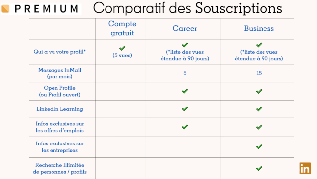 En complément à l’abonnement de base gratuit, LinkedIn « Premium » offre des fonctionnalités supplémentaires, telles que des formations online, un accès plus direct, de l’aide et de l’information exclusive. De plus, il permet de gérer et de développer son réseau.