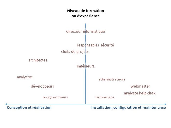 Il convient, pour mieux comprendre, de replacer ces métiers en fonction de leur domaine, que ce soit orienté conception ou exploitation, et du niveau de formation où d'expérience acquis. La figure suivante est reprise d'une présentation de l'IDEC de 2005. Ce graphe reste étonnamment correct malgré l'augmentation de la diversité des métiers.