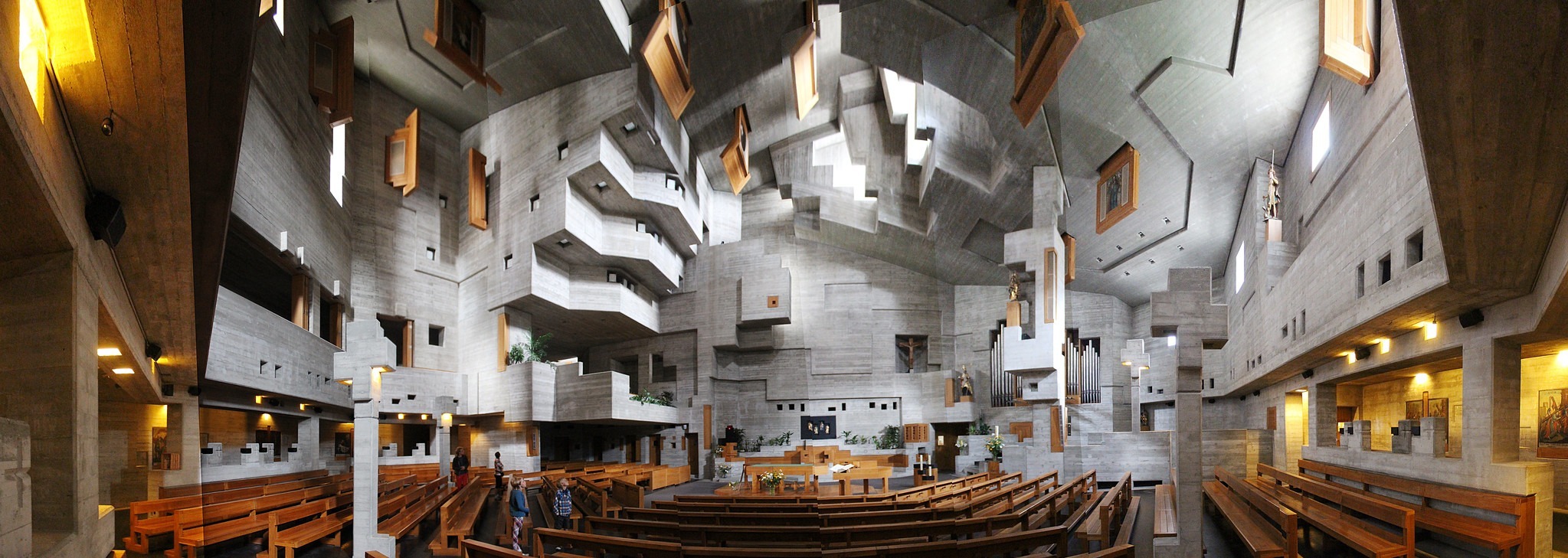 Walter Maria Förderer était un sculpteur, architecte, professeur d'université et homme politique suisse, connu grâce à la construction d'églises et d'écoles. Il est l'un des principaux représentants de l'architecture de l'église néo-expressionniste dans les années 60. Ses bâtiments d'église sont caractérisés par des plans d'étage polygonaux, la combinaison avec un centre paroissial, des volumes complexes et imbriqués ainsi qu'un éclairage indirect.
