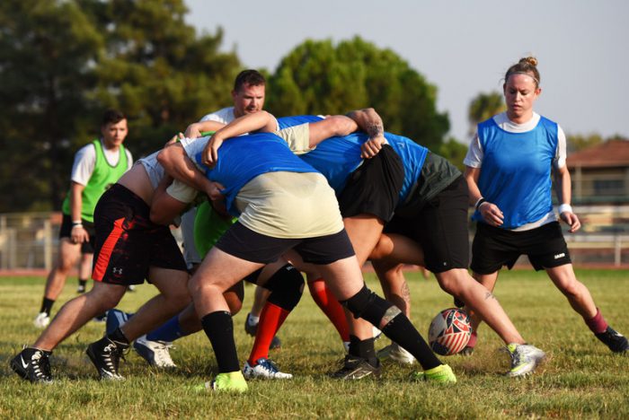 Airmen conduct a scrum during a rugby game. (U.S. Air Force Photo by Staff Sgt. Joshua Magbanua, 09.14.2019, at Incirlik Air Base, Turkey)