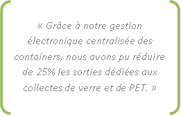 La gestion électronique des containers, que nous appelons Gestion Technique Centralisée (GTC), ne consiste pas uniquement à relever le niveau de remplissage d’un container, mais aussi à évaluer la rapidité avec laquelle ce remplissage se fait afin de planifier les vidanges. Par exemple, un container rempli à 50% peut mettre trois jours pour atteindre la limite de sa capacité dans une agglomération, tandis qu’un autre rempli aussi à 50% mettra encore une semaine avant d’être plein. Nous avons développé des modèles de prévision nous permettant d’optimiser les collectes. Ce système nous a permis de réduire de 25% les flux de mobilité relatifs à la collecte du verre et du PET en ville de Genève.