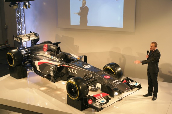 No better location could have been picked for the official unveiling of Sauber's new racing car than the wind tunnel of Sauber Motorsport AG in Hinwil. Partners, guests and selected media were placed in front of a small stage where a car covered in a white sheet grabbed the attention. Everyone present could feel the tension of this special moment and everyone would have liked to uncover the brand new high-tech car themselves. But this honour had been strictly reserved for the two main drivers, German Nico Hülkenberg (25) and Mexican Esteban Gutierrez (21), the team's new driver pairing: