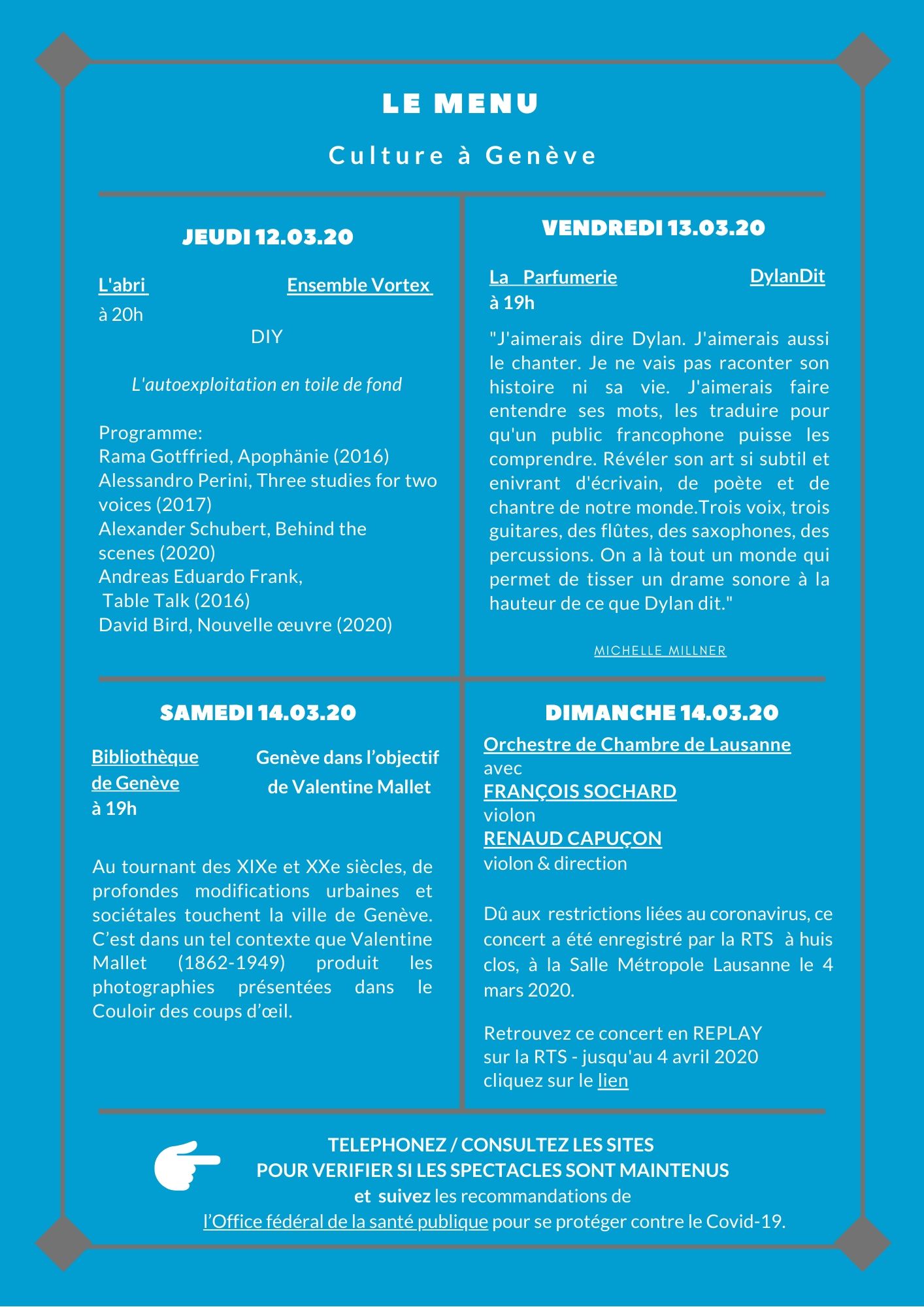 12 mars 2020 Sortir à Genève! Agenda du 12 au 15 mars 2020 Sources: La décadanse L'abri L'ensemble Vortex La parfumerie Michelle Millner Bibliothèque de Genève Orchestre de Chambre de... En lire plus