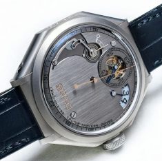 “Aesthetic and technology are a winning combination in this extreme model. The dial is symmetrical and balanced. The tourbillon gives a three-dimensional focus. The chiming is a wonderful sound for the auditory time-giving, with the left and right auxillary dial positions giving the hour and minutes.”