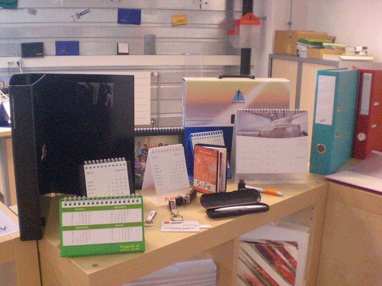 Afin de satisfaire la demande de nos clients, nous avons mis en place un service sur-mesure complet. Nous avons créé des dérivés des classeurs et nous nous sommes dirigés vers les fournitures de bureau et cadeaux d’entreprises personnalisés comme des porte-documents, des calendriers entre autres, utilisant les mêmes matières premières que les classeurs, soit le PVC, le carton ou le papier.