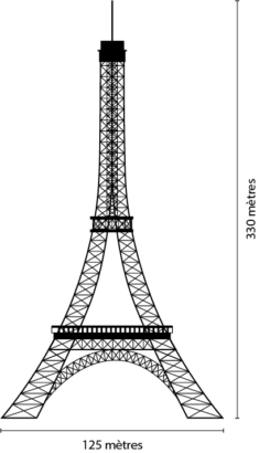 At 330 metres (1,083 ft), the Eiffel Tower is a tall iron structure with a lattice pattern. It is the height of an 81-storey building. An iconic symbol of Paris, it weighs over 10,000 tons, or some 7,000 cars, or 1.0 × 10^8 bananas. Its square base measures 125 metres (410 ft) on each side.