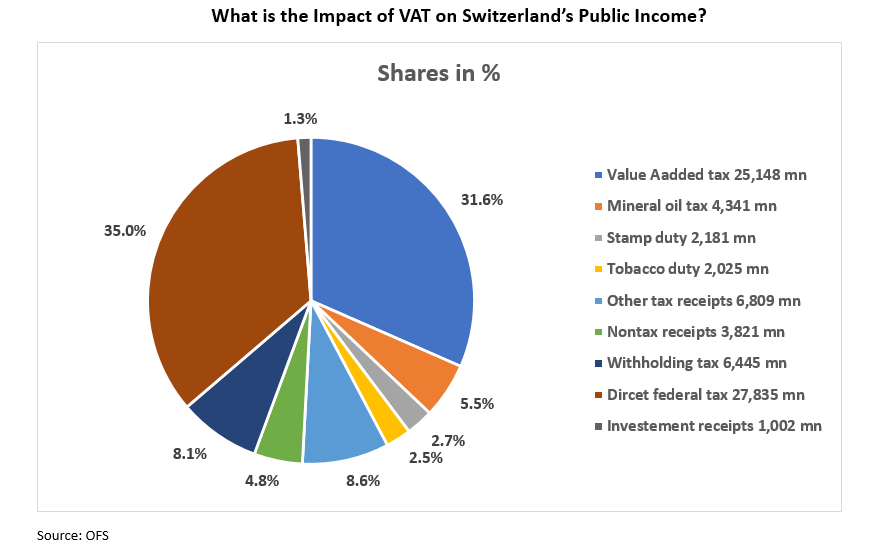 The Value Added Tax (VAT) plays a significant role in Switzerland’s public income. Let’s explore its weight and compare it to other sources of revenue: