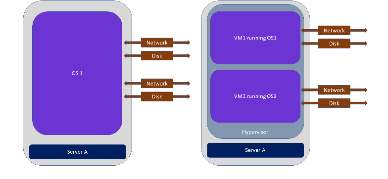 So here is the before-and-after of the non-virtualised and virtualised system, seen at the operating system level: