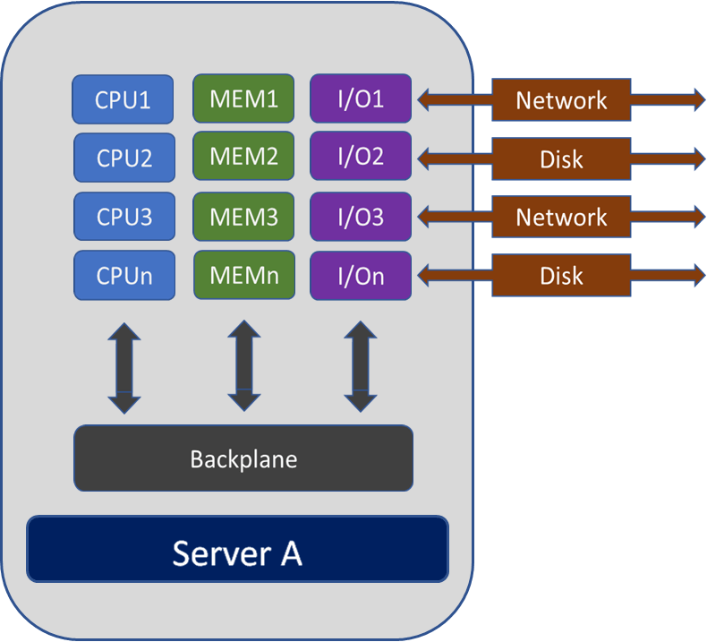 The server is based around the CPUs (central processing units, processors, or the “brains” of the machine), memory (Random Access memory stores information as needed), and I/O (Input/Output, how the machine talks to the outside world). These are connected by a backplane, which allows the components to communicate. For example, if program “A” running on CPU1 needs to send a message to another computer, it will have the information passed via the backplane to one of the I/O cards.